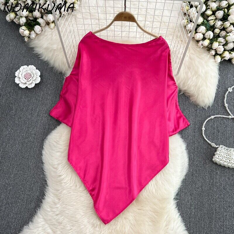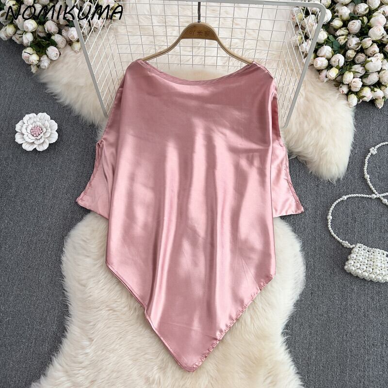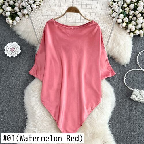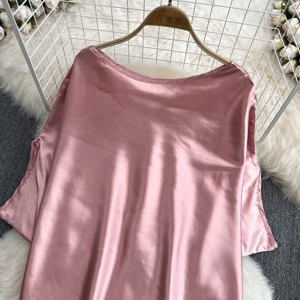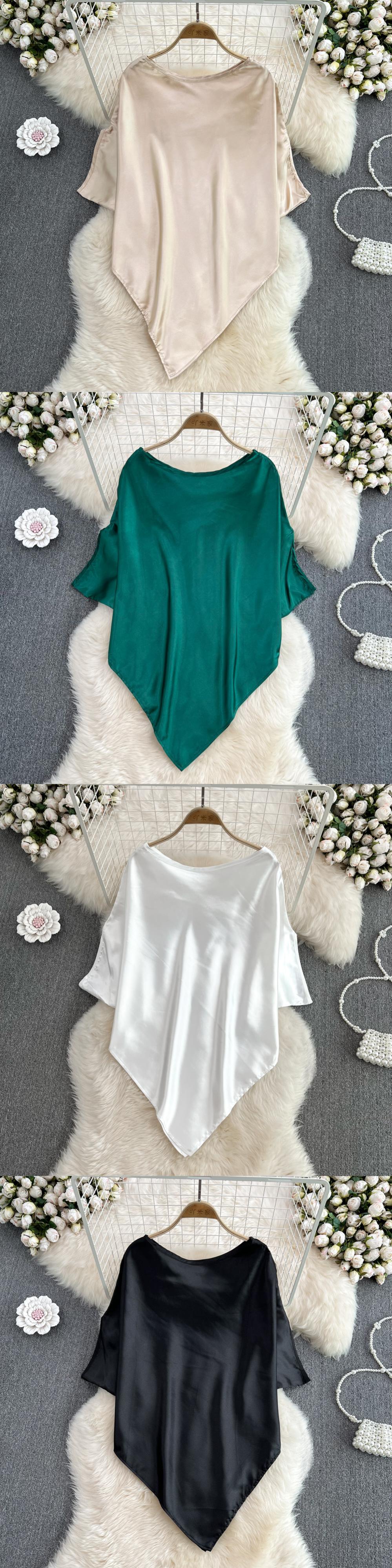 のみくまレディースサマーブラウス半袖Oネックサテンシルクベーシックイレギュラーミディアムロングトップスシャツ2022 ショート ハーフスリーブ 夏物 kor15602822415