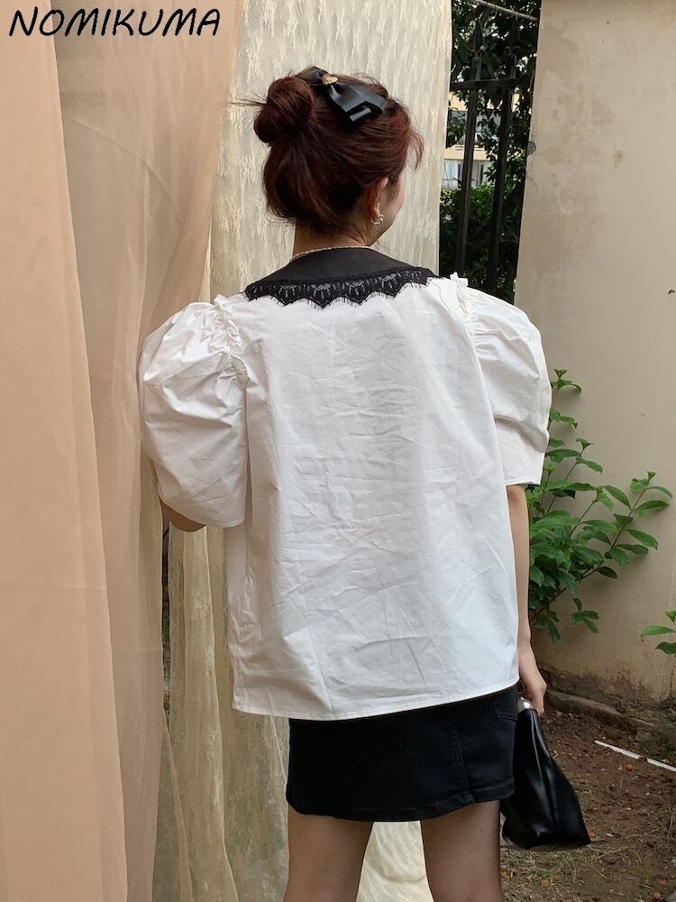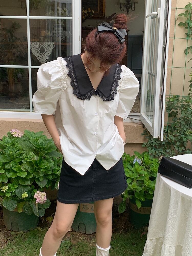 のみくまシックヒットカラーピーターパンカラーブラウスシャツCausalSweetPuffSleeveレディーストップスSummerDeModa 2022 大人ガーリー スウィート キュート カジュアル サマー 夏物 kor32106001597