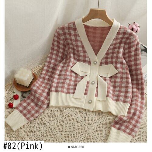 ノミクマレディース2022ヒットカラーチェック柄ニットコートスウィートボウノットVネックセーターカジュアル長袖ニットカーディガン ロング リボン 大人ガーリー キュート kor65889305889