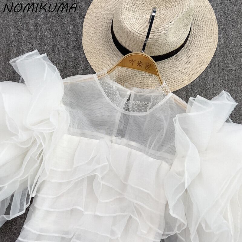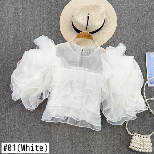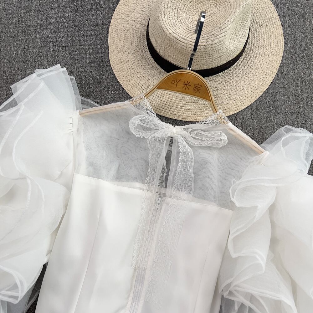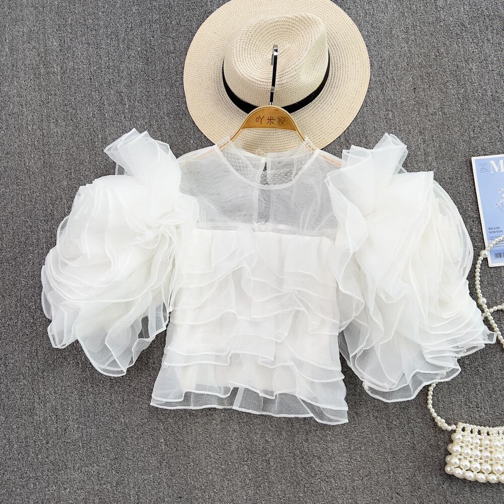 のみくまシックパフスリーブシフォンブラウスレディースサマーコーザルOネックトップシャツ2022ショートデ 夏物 kor15019168102