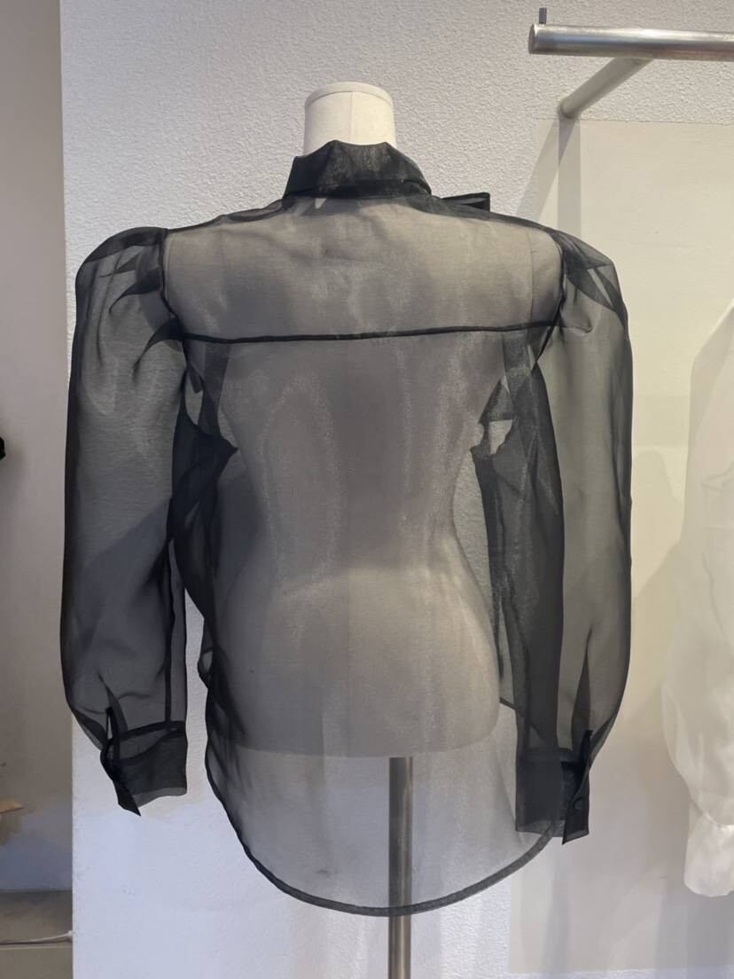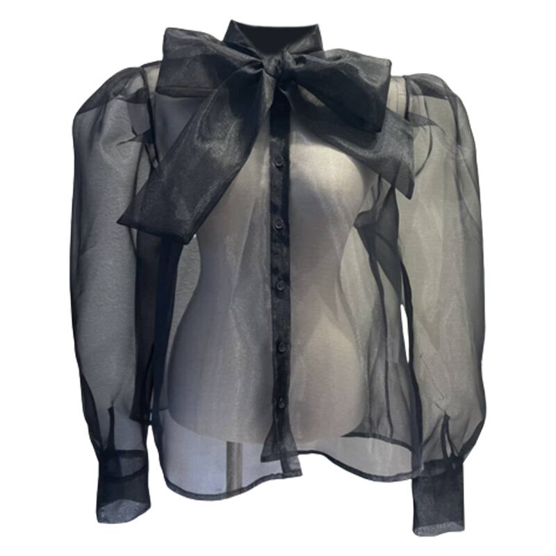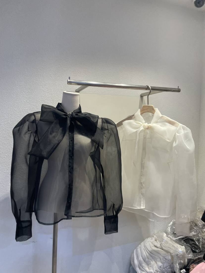 ノミクマシースルーメッシュレディースシャツシックボウネクタイカラーブラウストップスカジュアルパフスリーブ2022AutumnDe リボン オータム 秋物 kor39685543081
