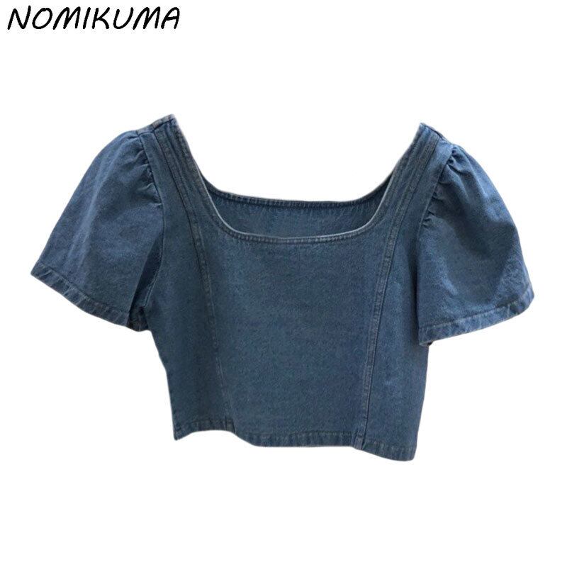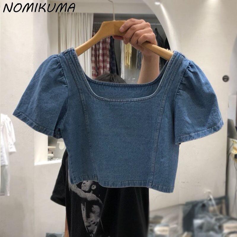 のみくまパフスリーブデミンショートブラウス女性2022年夏カウボーイスクエアカラーシックジーンズデ サマー 夏物 スクウェア kor50787679731