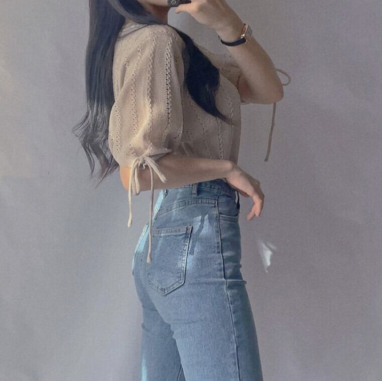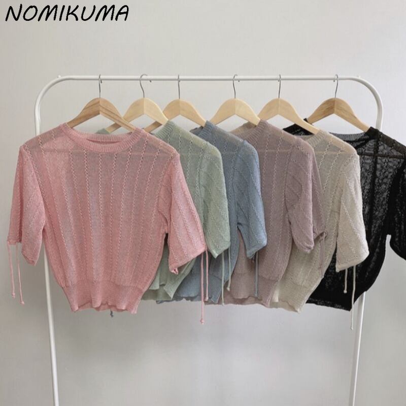 ノミクマ2022夏薄プルオーバーニットb蝶ネクタイパフスリーブ女性セーターCausalシックニットトップス リボン サマー 夏物 kor91674196440