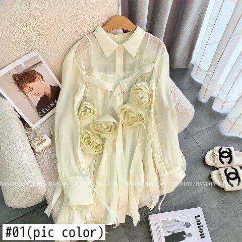 のみくまシックフラワーレディースブラウス因果長袖シャツ2022サマーレースアップシングルブレストターンダウンカラー ロング 夏物 フラワーデザイン kor41330562436