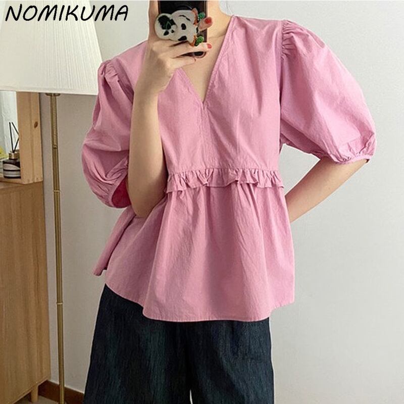 のみくまシックスウィートパフスリーブVネックブラウストップスCausal2022サマーウーマンドールシャツ食用ツリー菌フリル 大人ガーリー キュート カジュアル 夏物 kor31934111334
