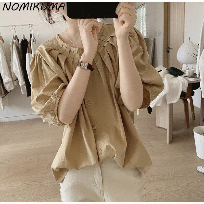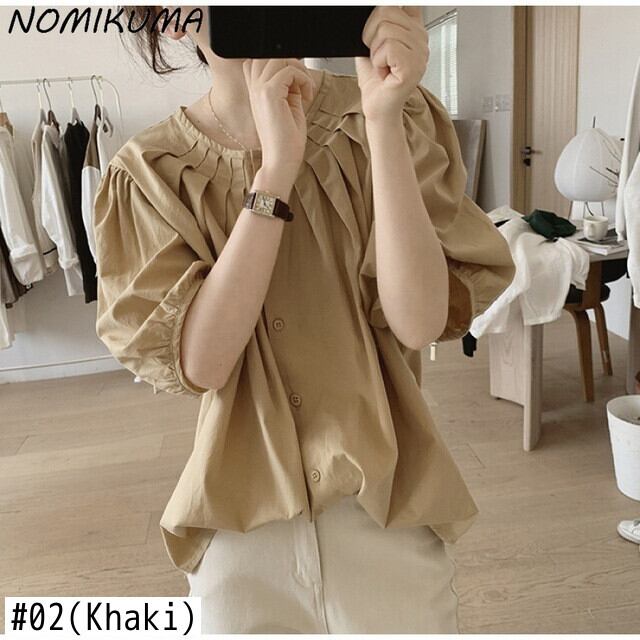 ノミクマフォールドOネックシャツレディースシックパフスリーブカジュアルブラウストップ2022サマーシングルブレストデモダ 夏物 kor28628636099