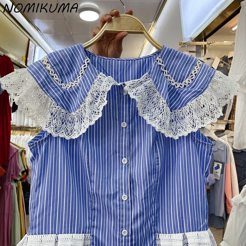 のみくまレースフリルパッチワークストライプブラウスシャツカジュアルノースリーブピーターパンカラーレディーストップス2022夏 サマー 夏物 kor83963757522