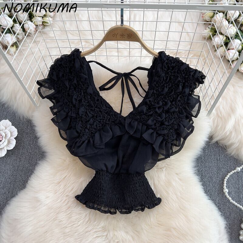 ノミクマ2022シックな食用の木菌フリル折りストレッチスリムショートブラウスフライングスリーブレースアップVネックバックレスシャツ kor4923505168