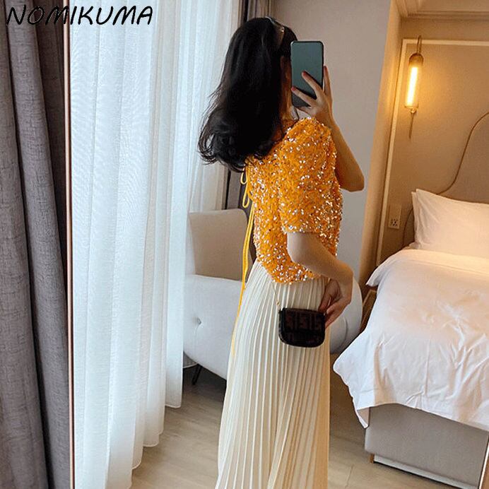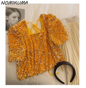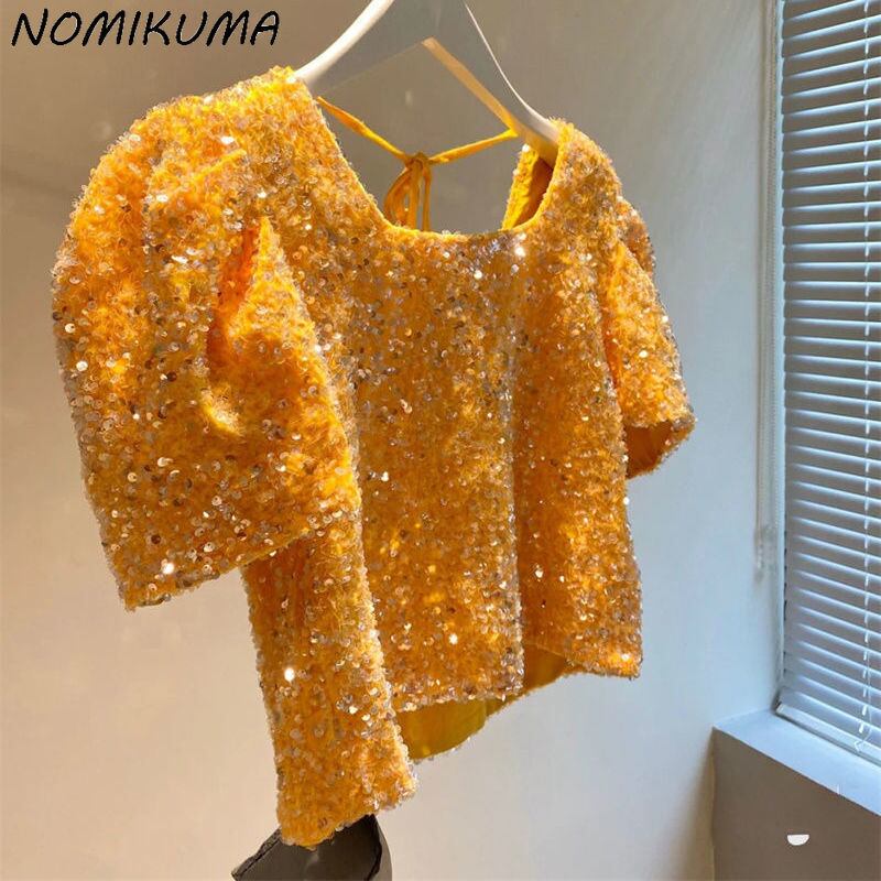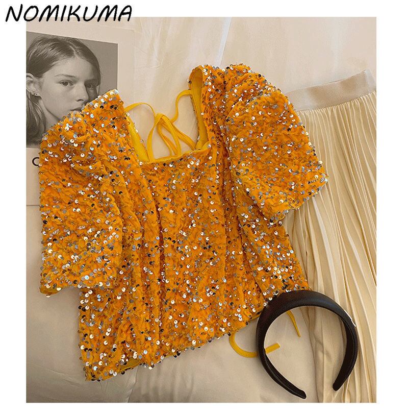 Nomikuma Blignbling Sequins Blouses Women Summer Puff Sleeve Shirts 2022 Lace Up Square Collar Chic Tops レース シャツ ブラウス サマー 夏物 レースアップ スクウェア kor3462380615