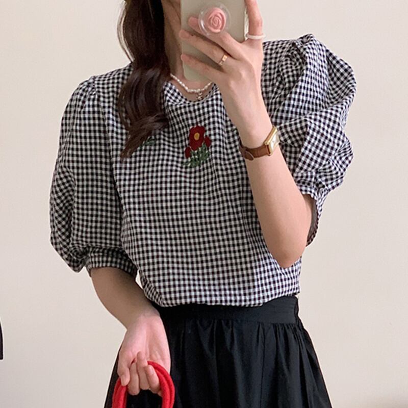 のみくまシックサマーチェック柄ブラウストップス花柄刺繡ウーマンシャツ2022パフスリーブプルオーバー 刺繍 夏物 kor71689964594