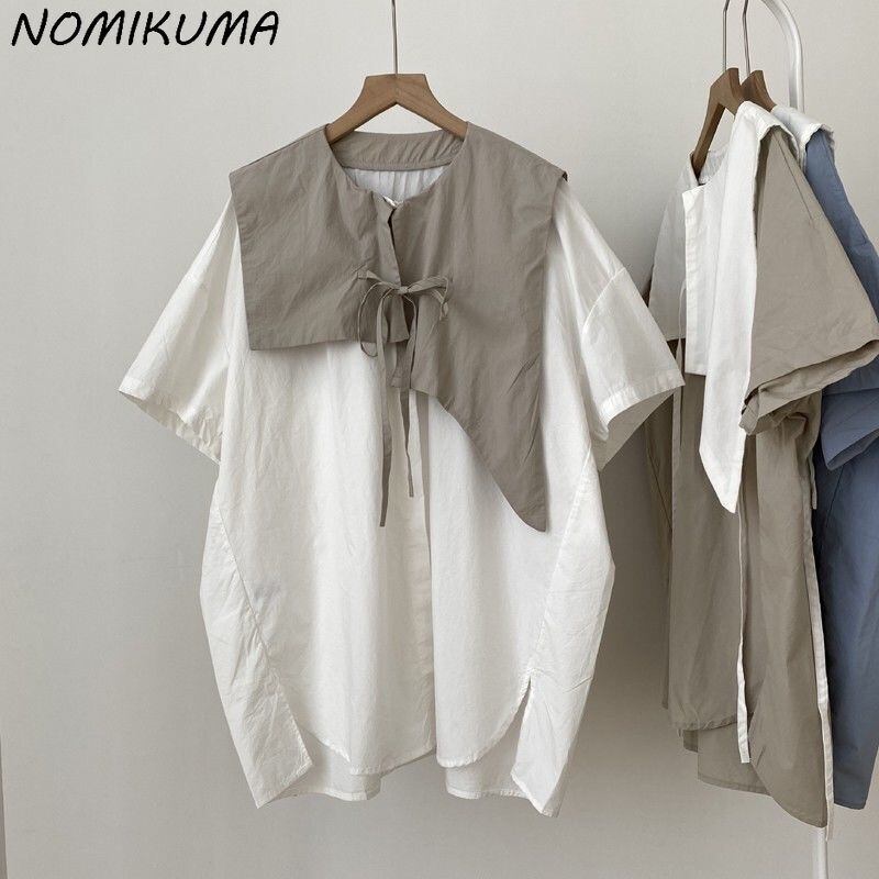 ノミクマスタイルの女性ブラウスフェイクツーピース因果半袖トップス2022サマーレースアップOネック ショート ハーフスリーブ 夏物 kor99359939697