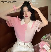 ノミクマコントラストカラーショートニットシックパフスリーブターンダウンカラーニットトップス2022サマーセーター 夏物 kor86561641394