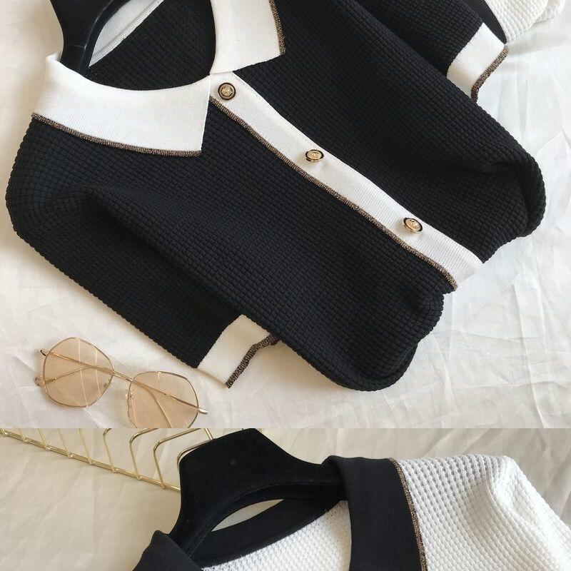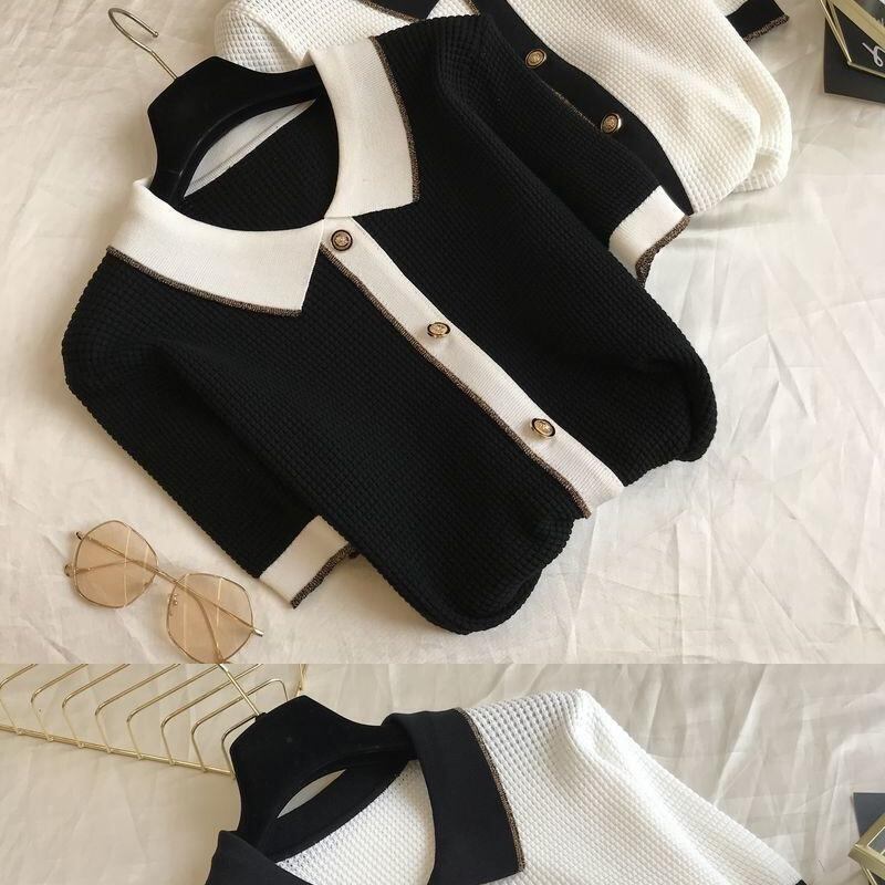のみくまコントラストカラー薄手のニットプルオーバー原因半袖ターンダウンカラー2022秋ニットセーター女性 ショート ハーフスリーブ オータム 秋物 kor18259311690