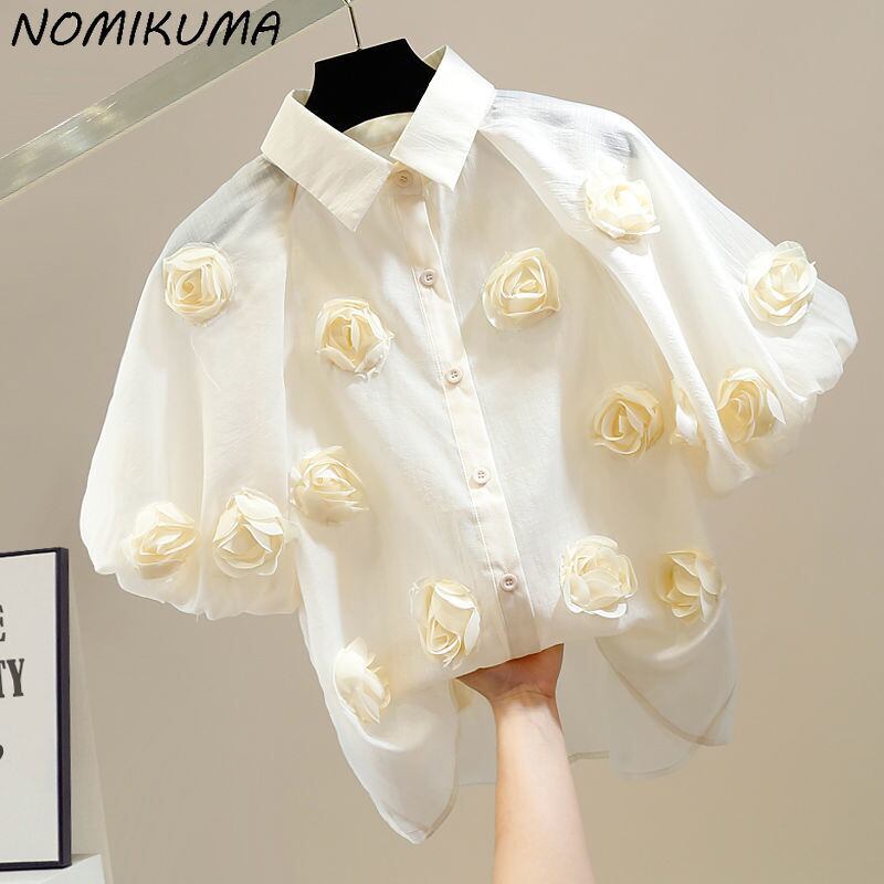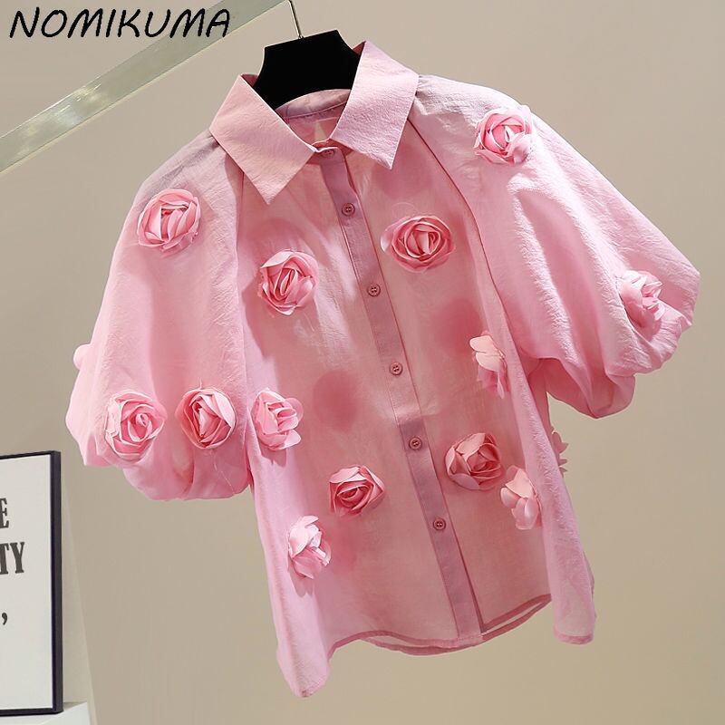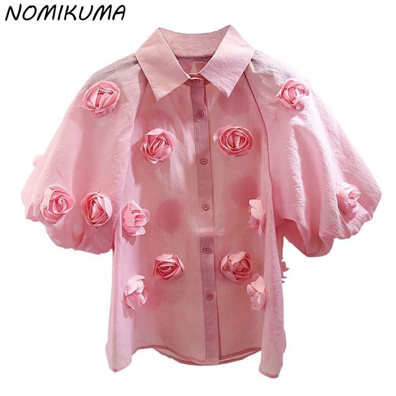 のみくまスウィート3Dフラワーブラウスレディースランタンスリーブターンダウンカラーシャツ2022年夏シックデ 大人ガーリー キュート カジュアル サマー 夏物 フラワーデザイン kor90653260957