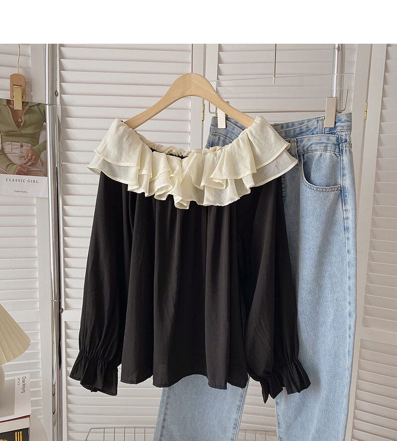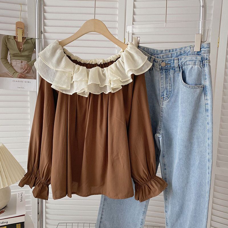 ノミクマ2022レディーストップスヒットカラーフリルオフショルダー長袖ブラウスシャツ秋のプルオーバートップス ロング オータム 秋物 kor34519125078