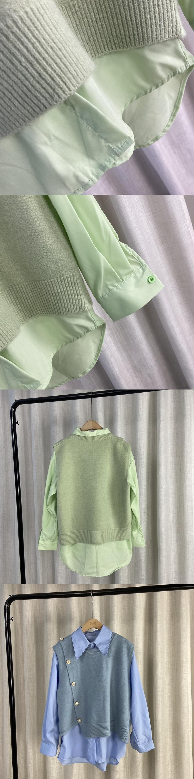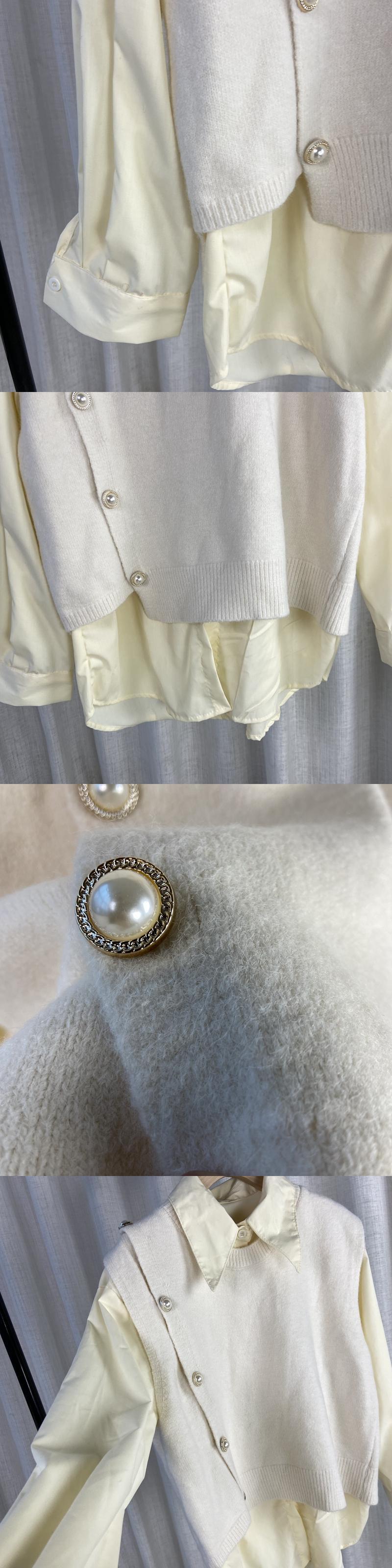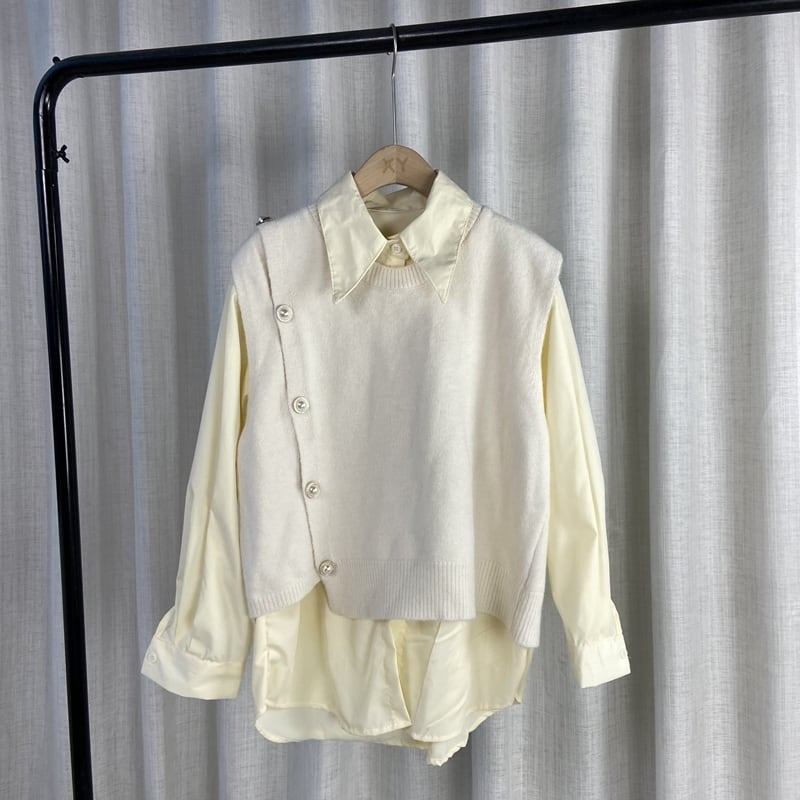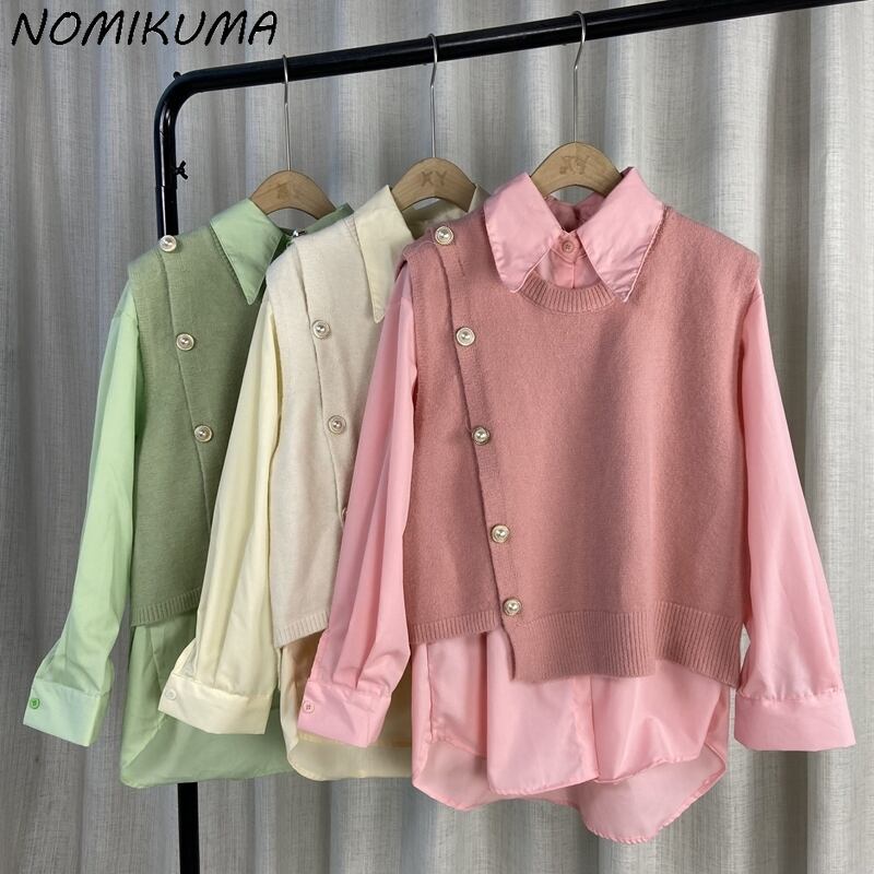のみくま2022ツーピースレディースセット長袖ターンダウンカラー無地ブラウストップス+ノースリーブOネックプルオーバーニットベストスーツ ロング ソリッドカラー kor80376212968
