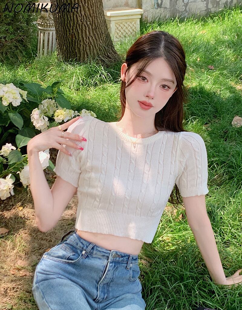 のみくまシック中空蝶結びスリムクロップニット半袖Oネック女性セーター2022夏ニットプルオーバー ショート リボン ハーフスリーブ サマー 夏物 kor82950754029