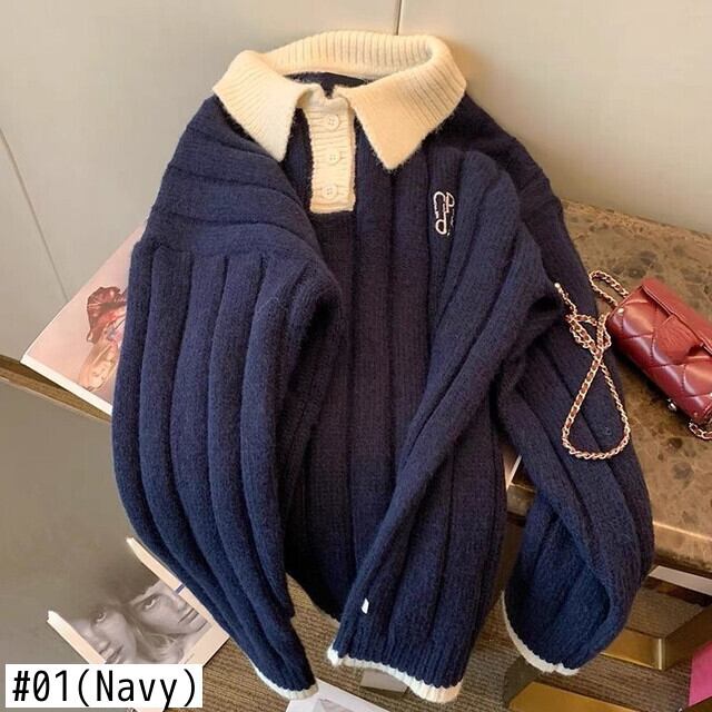 ノミクマコントラストカラーターンダウンカラーウーマンセーター2022秋冬プルシック刺繡ニットトップス 刺繍 オータム 秋物 ウィンター 冬物 kor75396113866