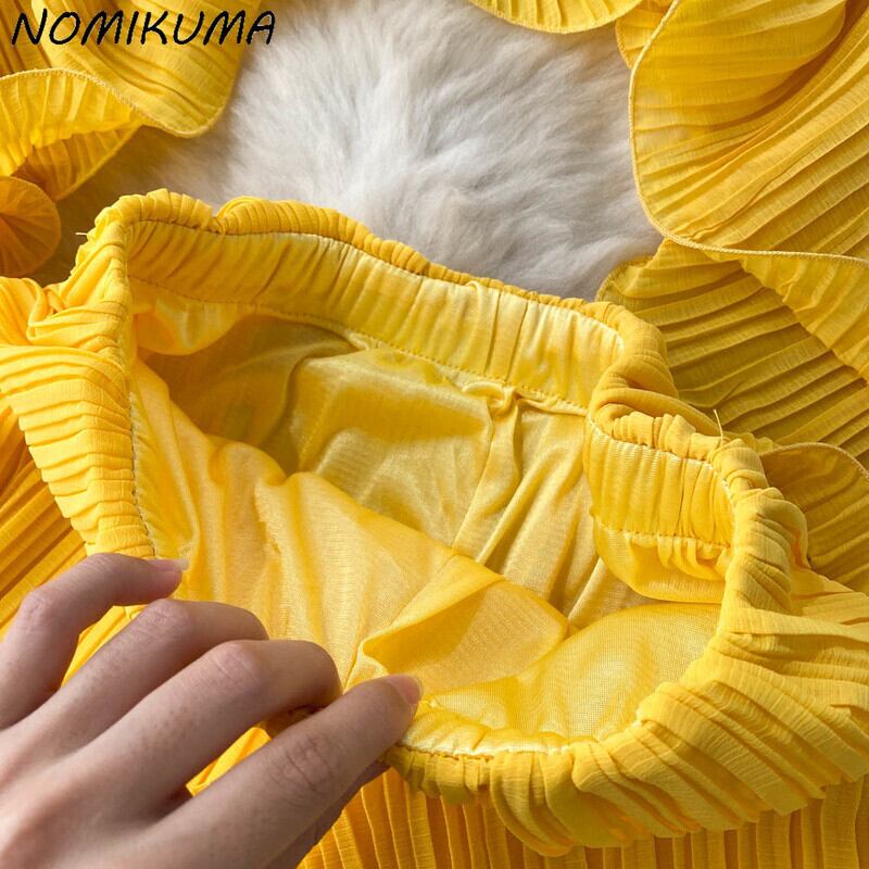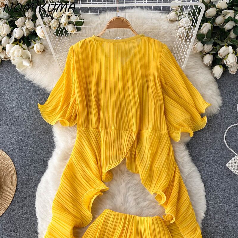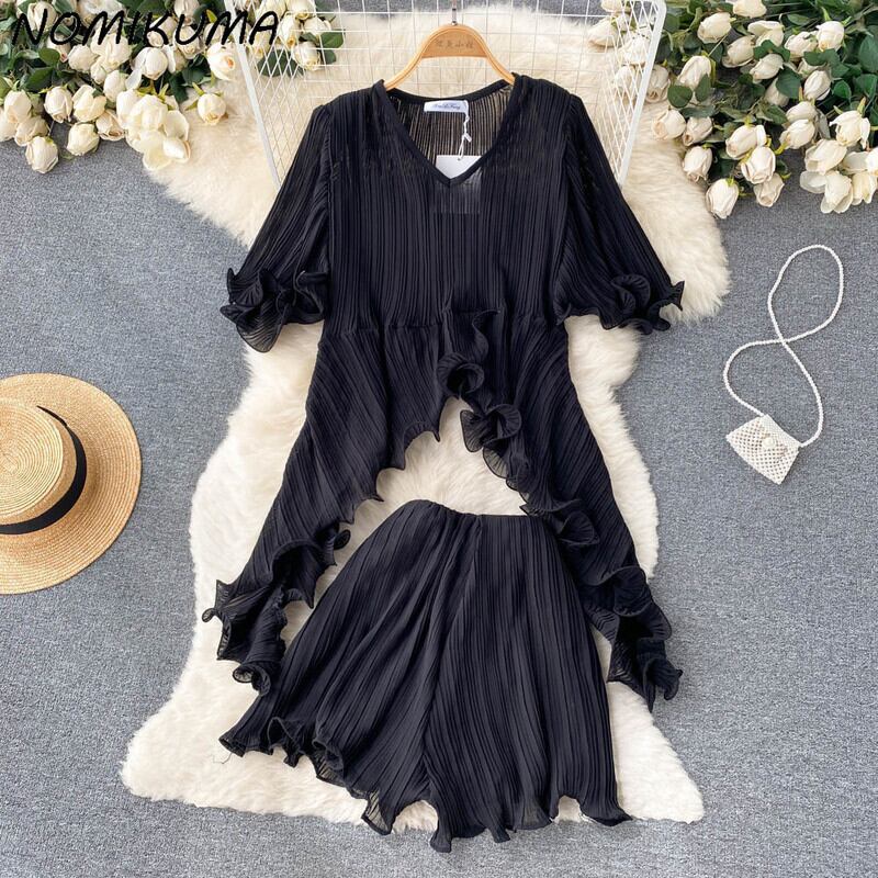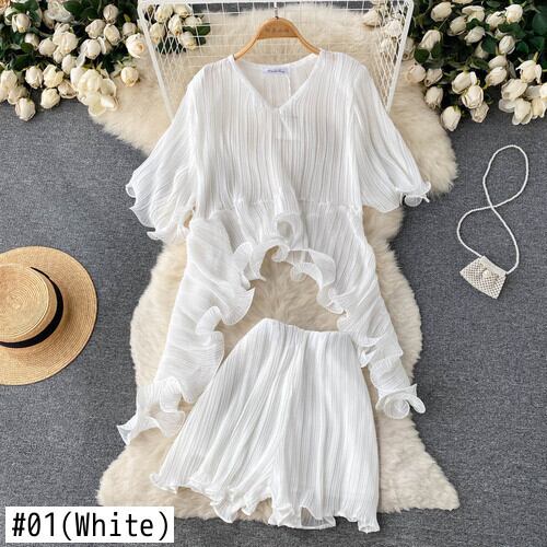 のみくまシフォンツーピースセット因果不規則Vネックフレアスリーブブラウストップス+ウエストワイドレッグショーツ2022 ブルマー ワイドパンツ kor34605431560