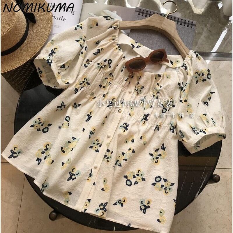 ノミクマシック2022夏フローラルウーマンシャツパフスリーブスクエアカラーブラウストップス因果シングルブレストフェミニマ サマー 夏物 花柄 スクウェア kor48886102234