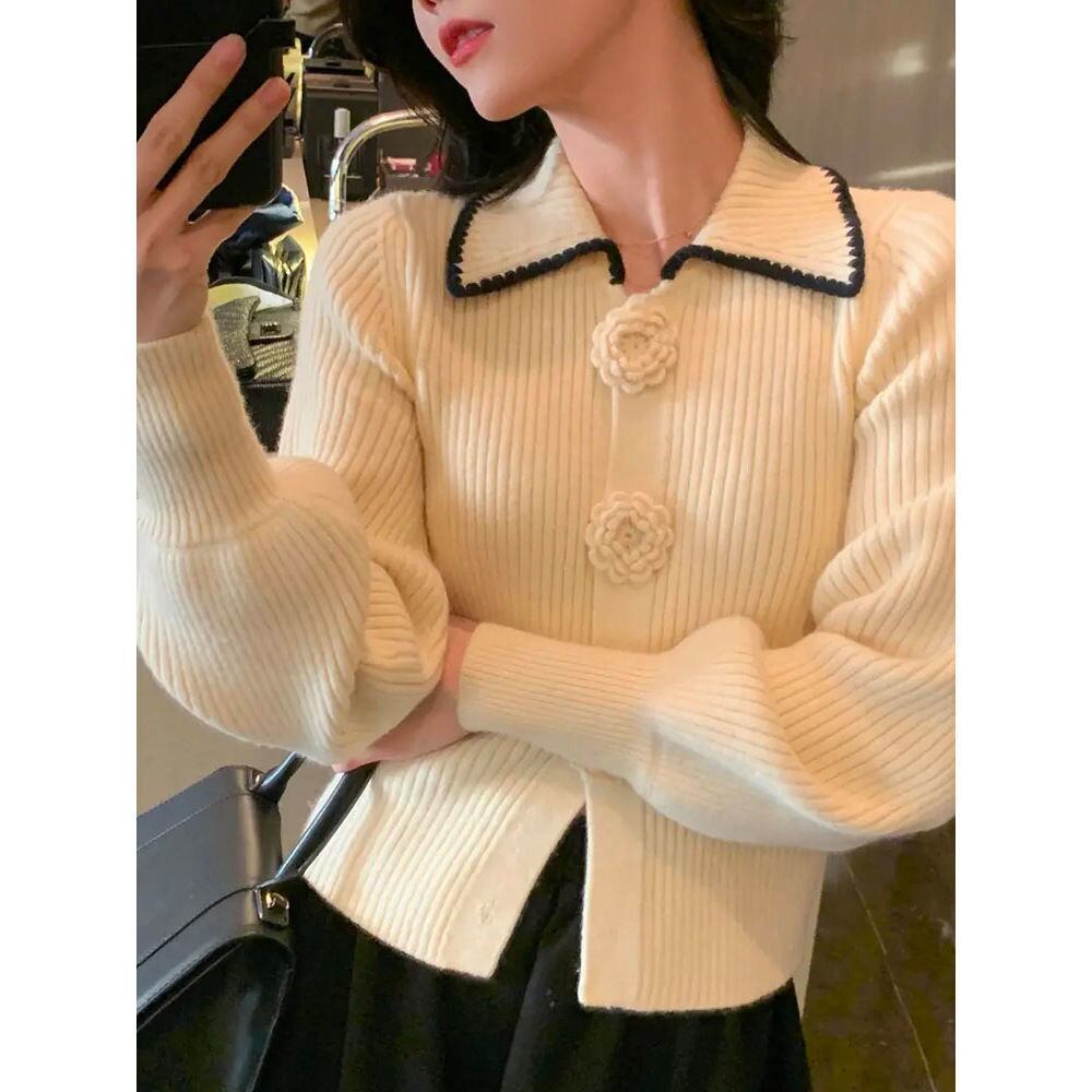 のみくまシックフラワーシングルブレストレディースカーディガンセーター2022秋冬ターンダウンカラースリムニットコート オータム 秋物 ウィンター 冬物 フラワーデザイン kor68306717943