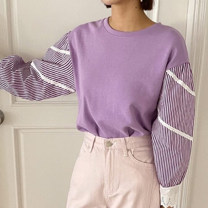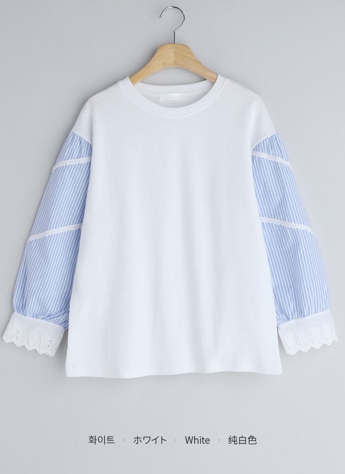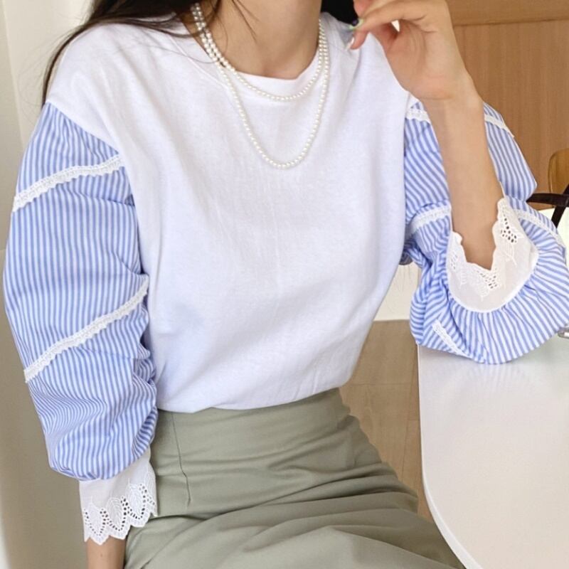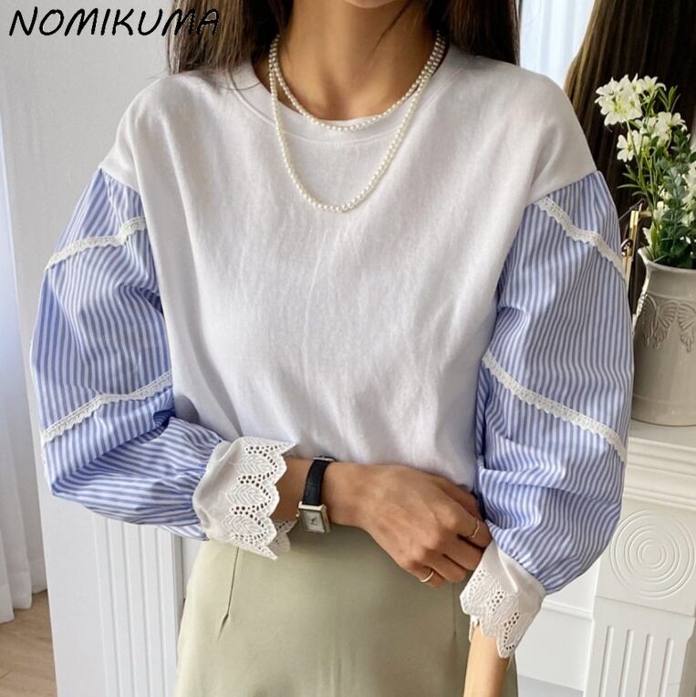 ノミクマシックレースパッチワークストライプ長袖ウーマンシャツCausalO-neck2022秋のプルオーバートップスフェミニマ ロング オータム 秋物 Oネック kor52946471422