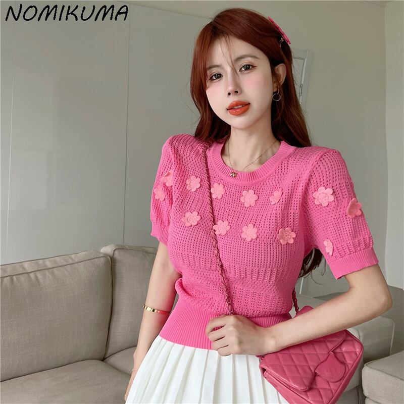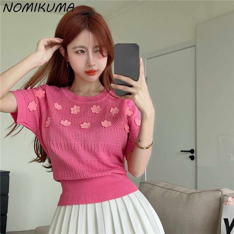 ノミクマアイスシルクホローアウトフックニットスリムウエストウーマンニットトップス2022夏半袖Oネックセーター ショート ハーフスリーブ サマー 夏物 kor70995794402
