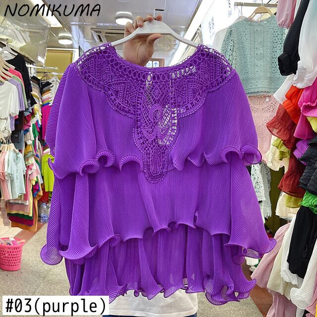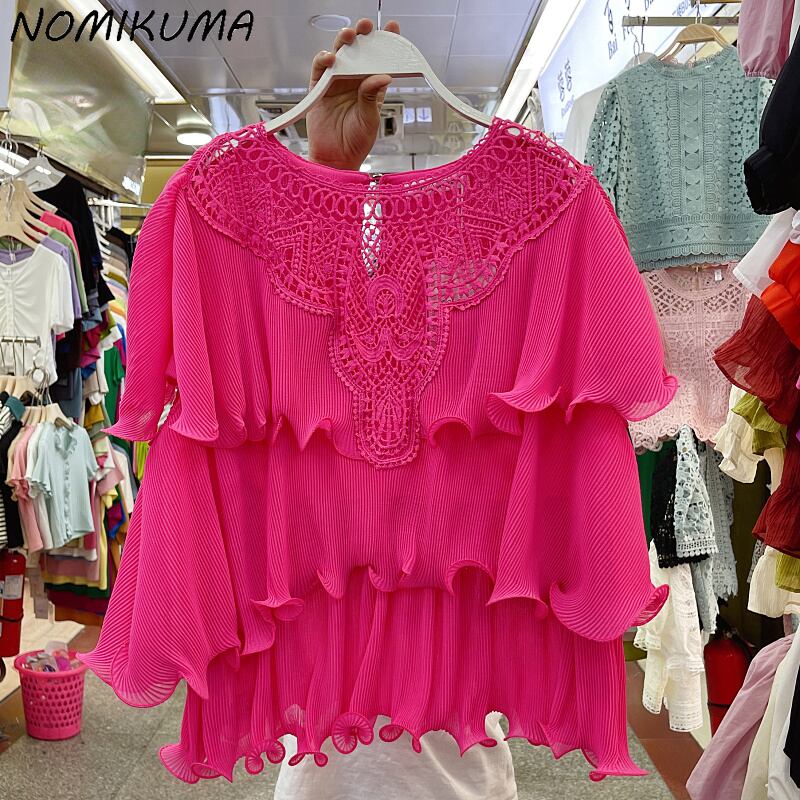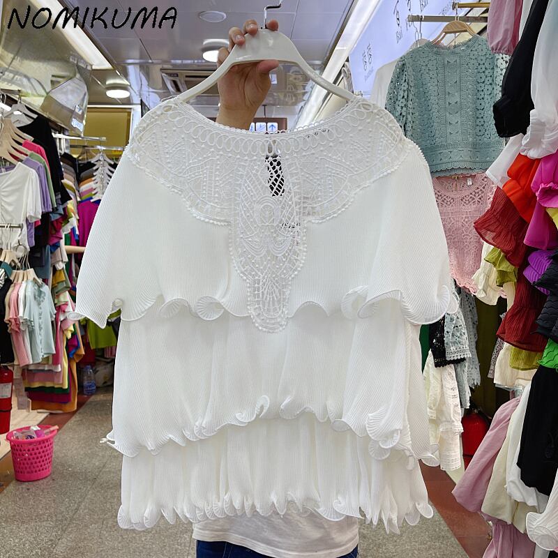 ノミクマレースパッチワークフォールドフリルシフォントップスCausalButterflyスリーブOネックブラウスシャツ2022夏 サマー 夏物 kor55911651935
