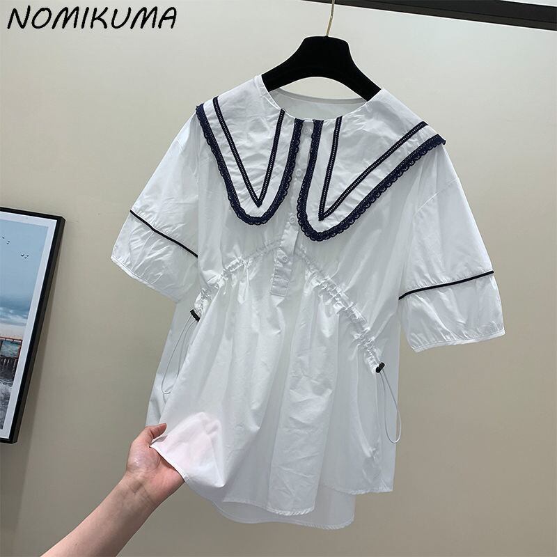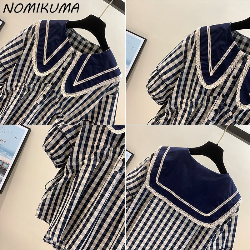 ノミクマピーターパンカラーチェック柄半袖ブラウストップスレディース2022サマーシャツダーウストリングスリムウエスト ショート ハーフスリーブ 夏物 kor75277749452