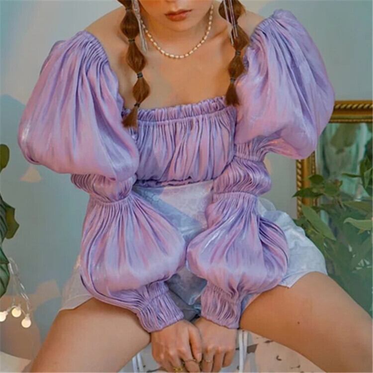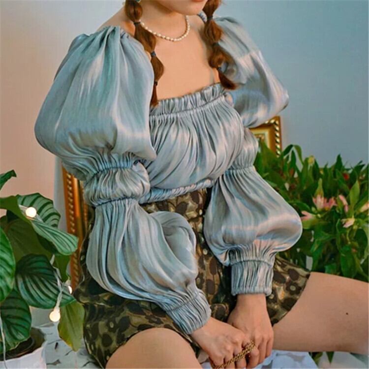 ノミクマフォールドパフスリーブスクエアカラーブラウスレディース2022サマーショートトップスシックデモダ 夏物 スクウェア kor84143884378