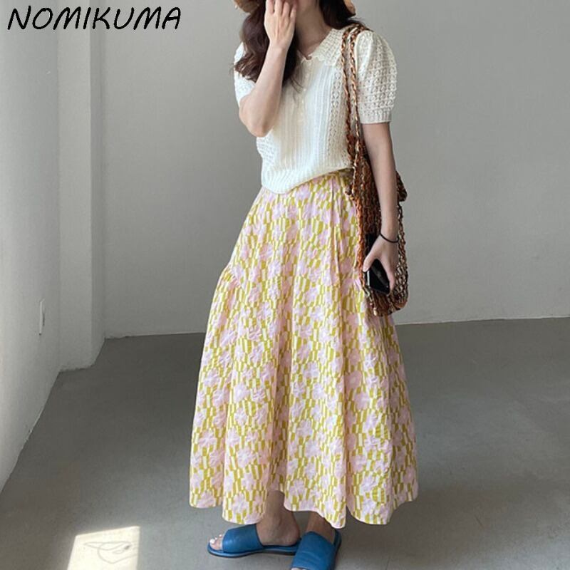 ノミクマレディースサマーホローアウトニットスウィートパフスリーブターンダウンカラーウーマンセーター2022プルオーバーニットトップス 大人ガーリー キュート カジュアル 夏物 kor63223356982