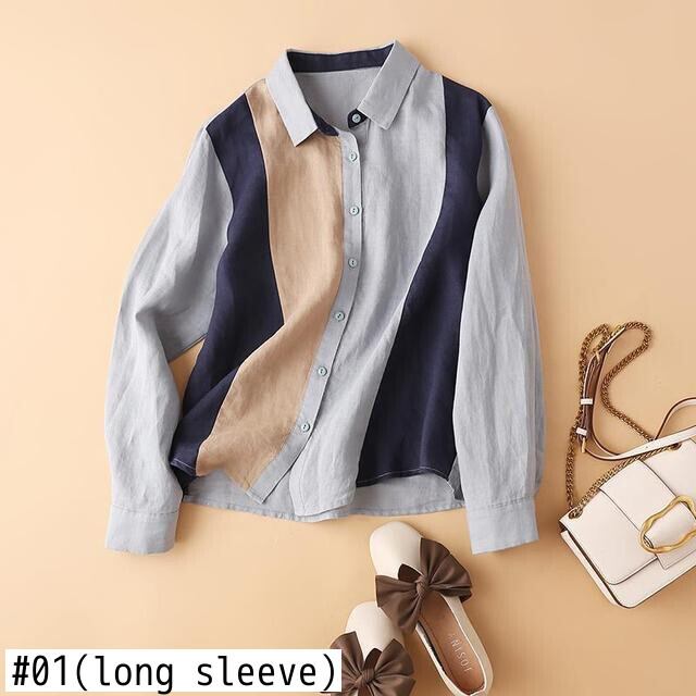 のみくまコントラストカラーコットンリネンブラウスレディース長袖ターンダウンカラーシャツCausal2022Blusa ロング kor2018681717