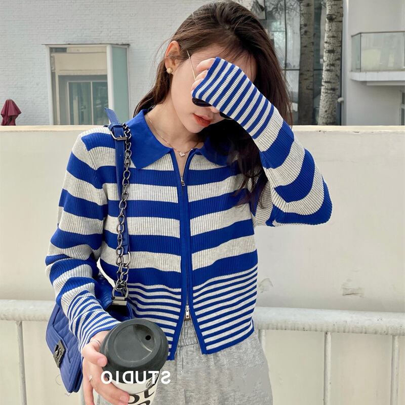 のみくまストライプセーターカーディガンジッパーターンダウンカラー長袖ニットコート2022秋ニットトップス ロング オータム 秋物 kor91837699037