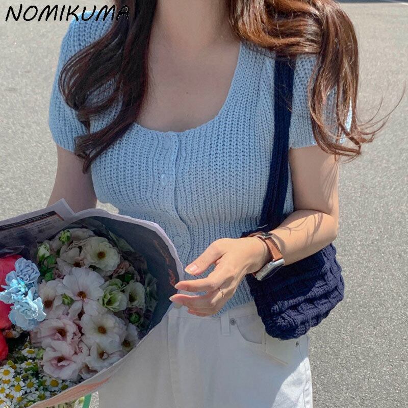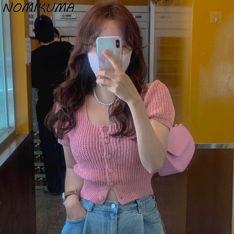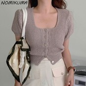 ノミクマサマースリムニットトップ2022スクエアカラー半袖シングルブレストセーターコートレディースニットカーディガン ショート ハーフスリーブ 夏物 スクウェア kor27476487209