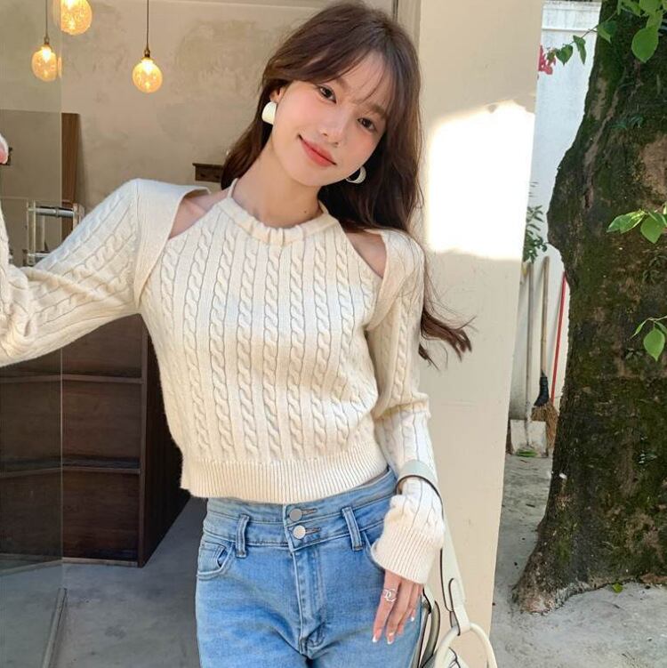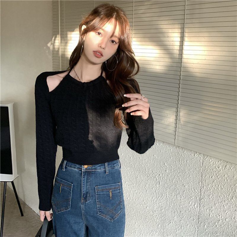 のみくまショートフェイクツーピースセーターレディース2022秋ニットトップス中空ホルター長袖スリムプル ロング オータム 秋物 kor76060447029