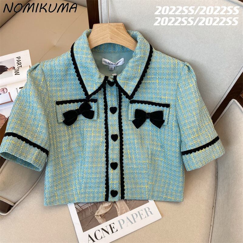 ノミクマチェック柄2点セットシックな蝶結びスウィートスーツパフスリーブターンダウンカラーショートトップス&ミニプリーツスカート リボン 大人ガーリー キュート カジュアル kor40492864597