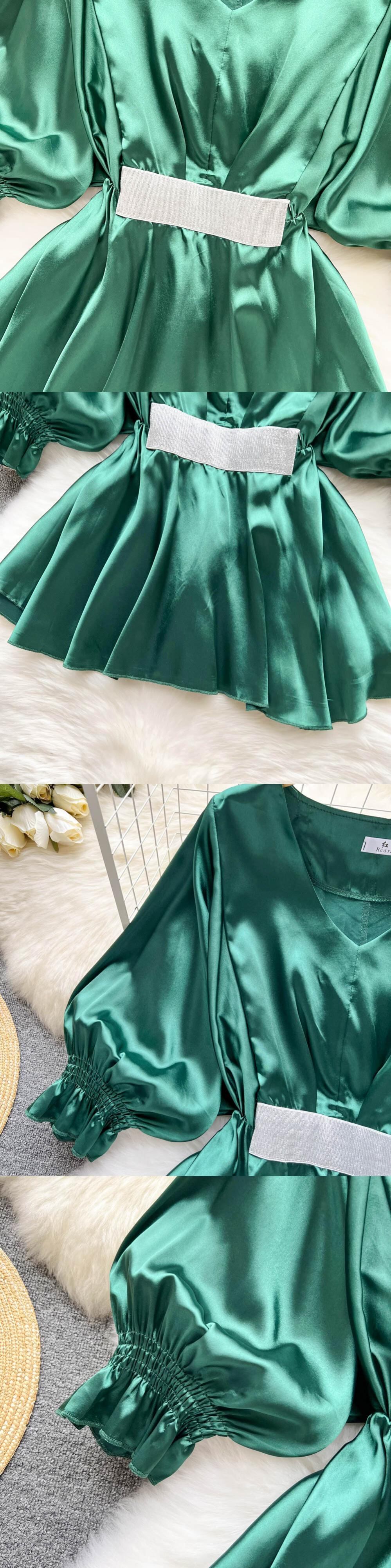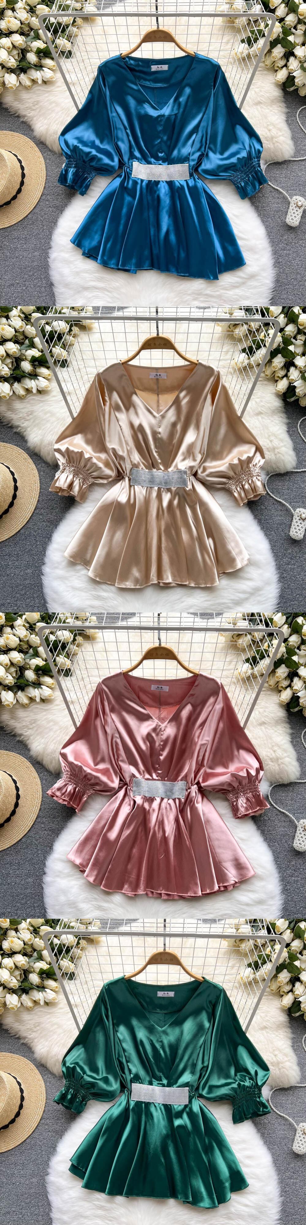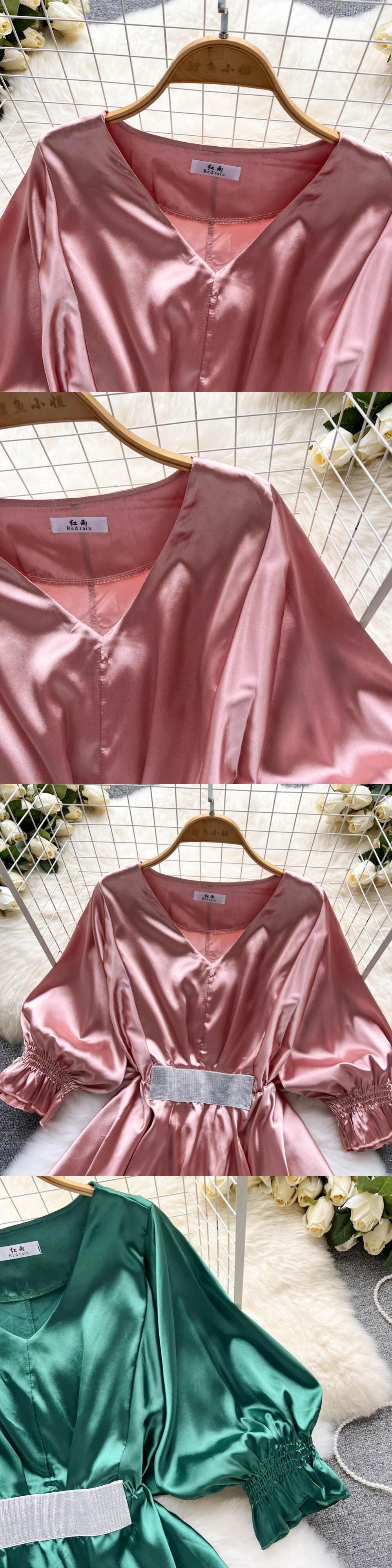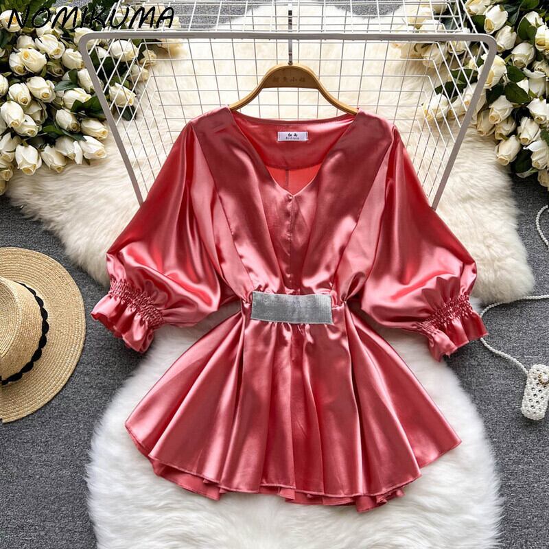 ノミクマサテンレディースブラウススリムウエスト2022年夏トップスカジュアルパフスリーブVネックシャツ サマー 夏物 kor2488167469