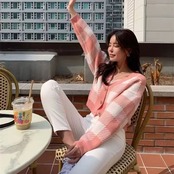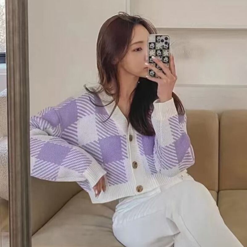 のみくまVネックチェック柄ニットカーディガンコート因果長袖2022年秋セーターショートニットアウタートップス ロング オータム 秋物 kor52727876497