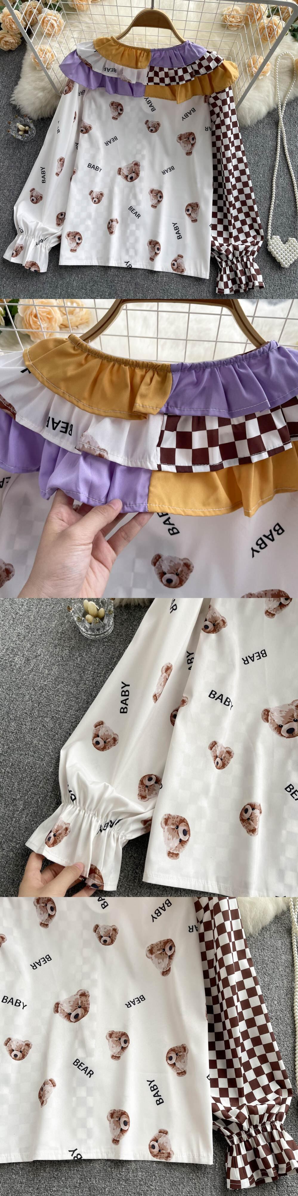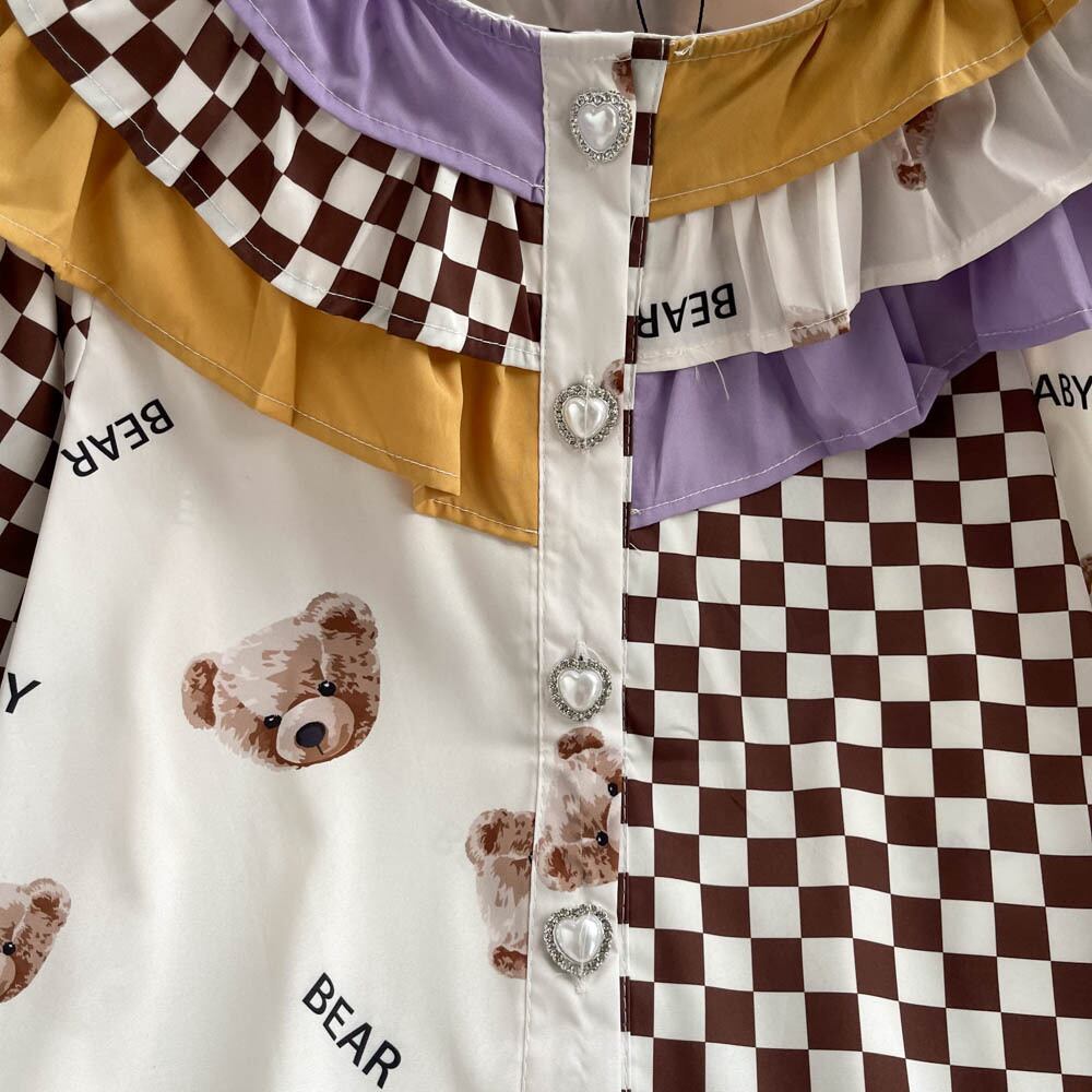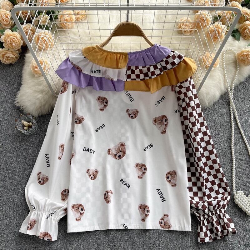 KUSAHIKIチェック柄プリントブラウスシャツシックフリルカラー長袖レディーストップス因果関係 ロング kor66069646348