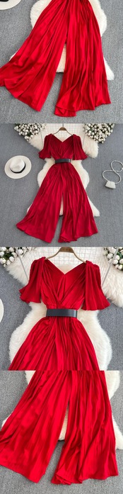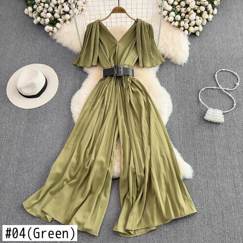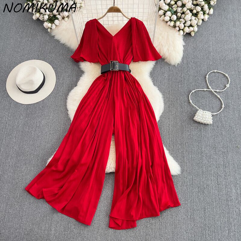 ノミクマサマーVネックバタフライスリーブジャンプスーツ女性2022ロンパースベルトスリムウエストワイドレッグボディスーツ 夏物 ハーネス ワイドパンツ kor26950932885