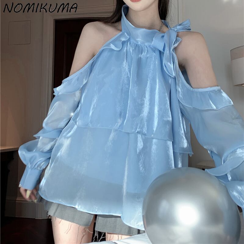 のみくまボウ包帯ホルターサンプロテクションブラウス2022夏セクシーストラップレス長袖シャツ因果フリルシック ロング リボン サマー 夏物 kor19082980739