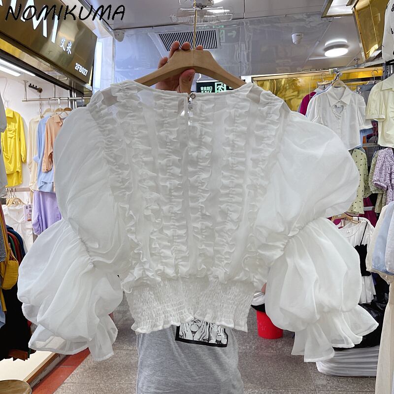 のみくまシックブラウス2022サマースウィート食用キノコ菌シフォントップスランタンスリーブOネックショート 大人ガーリー キュート カジュアル 夏物 kor87229710869