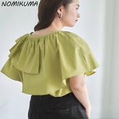 ノミクマスタイルレディーストップスシックなイレギュラーフリルVネック半袖ブラウスシャツ2022サマーソリッドスウィート ショート ハーフスリーブ 大人ガーリー キュート カジュアル 夏物 ソリッドカラー kor65059987358