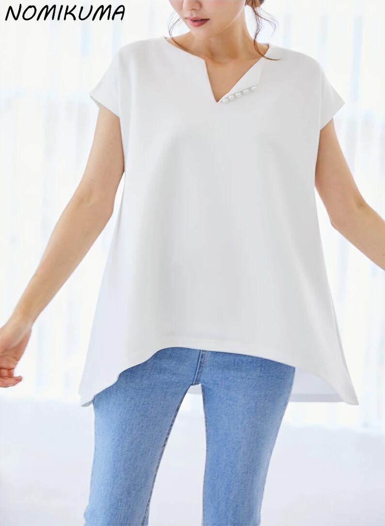 ノミクマ2022スタイルレディースブラウスシックビーズVネック半袖ドルシャツ因果ソリッドプルオーバーブルーサ ショート ハーフスリーブ ソリッドカラー kor45740417952