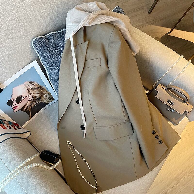 のみくまダブルブレストフード付きスーツコート2022秋長袖ブレザージャケットアウタートップス ロング オータム 秋物 kor85432215425