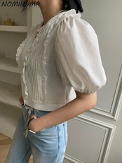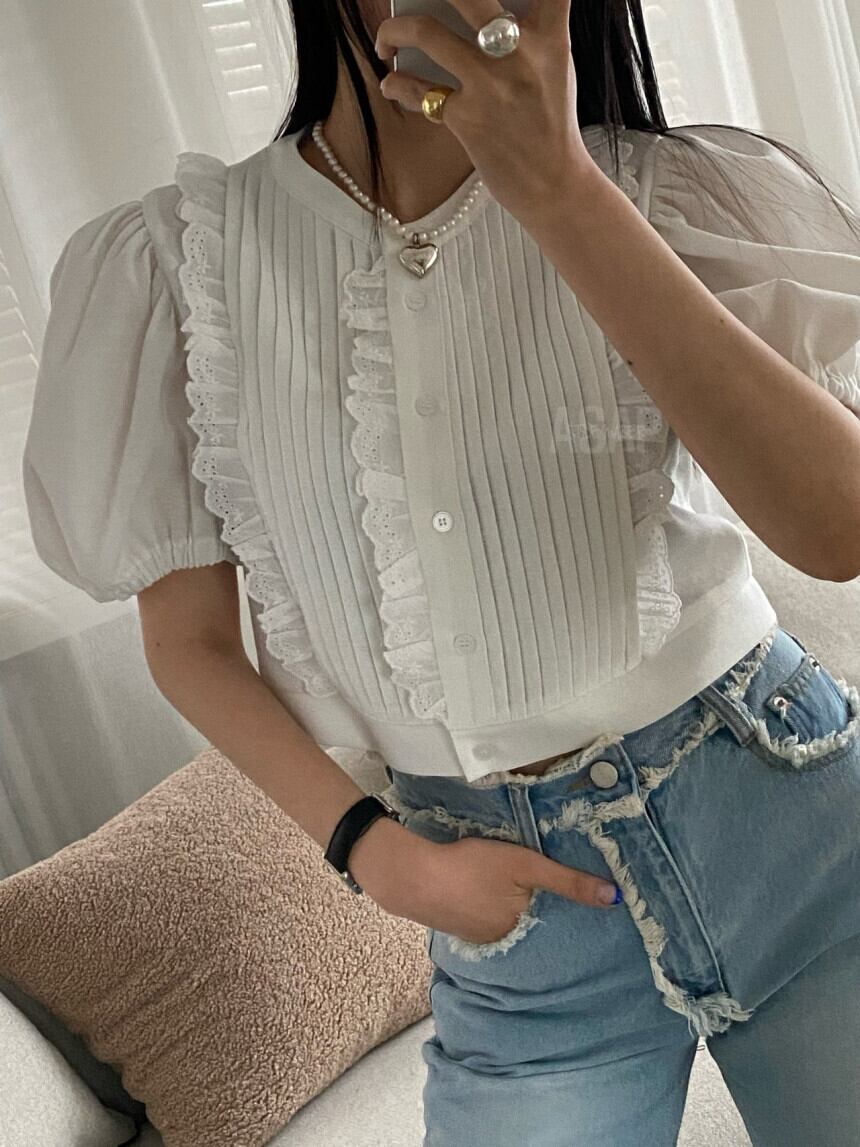 のみくまシック刺繍レースフリルパフスリーブブラウスシャツ折り畳みOネックレディーストップスSumemr2022 kor3123644913