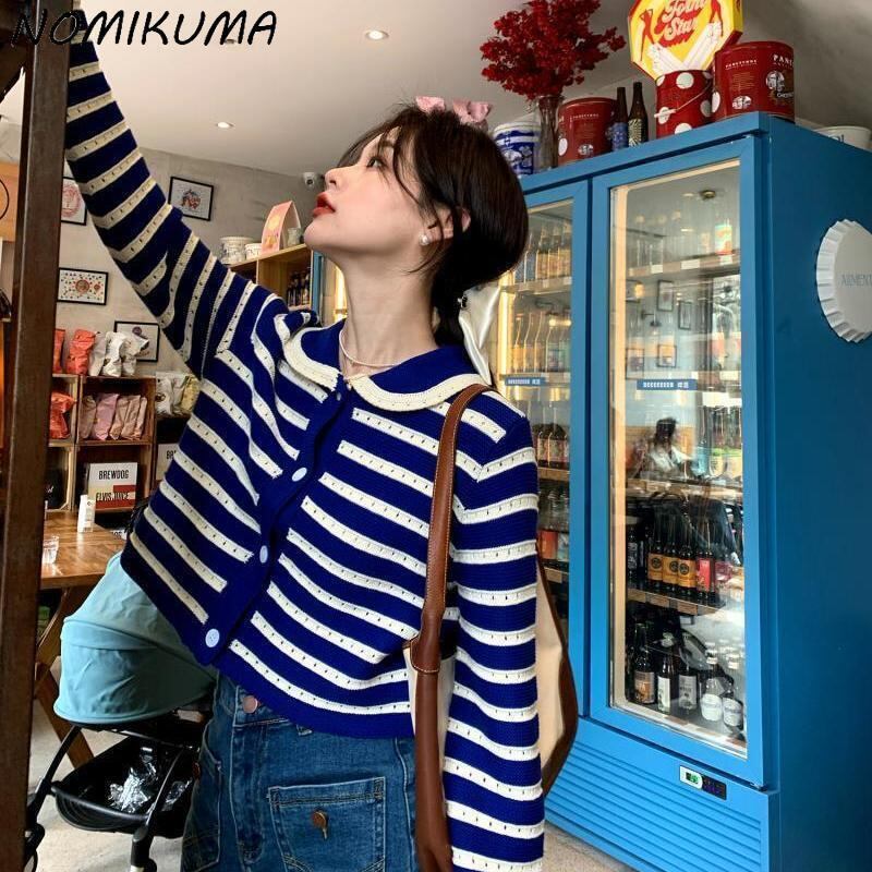のみくま長袖ニットカーディガンレディースヒットカラーピーターパンカラーセーターコートシングルブレストストライプニットトップス ロング kor97180262341