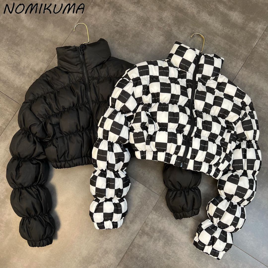 ノミクマレディースジッパーフォールドパフスリーブショートチェック柄アウタートップス2022スタンドネックウィンターコートジャケット6N891 冬物 kor62515611368
