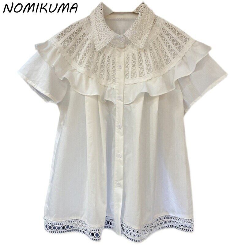 のみくまストライプレディースブラウスシックレースホローアウトフリル2022夏半袖ターンダウンカラートップシャツ ショート ハーフスリーブ サマー 夏物 kor83875663059