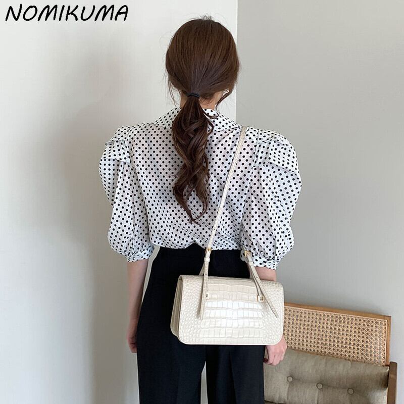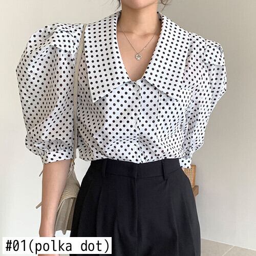 のみくまターンダウンカラーポルカドットブラウスシャツCausalシックパフスリーブレディーストップス2022夏 サマー 夏物 kor17387945200